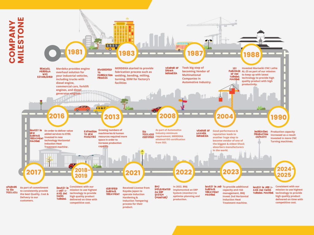 Bengkel Merdeka (Merdeka Workshop) was founded on 1981 as a direct answer to the needs of engine overhaul solution back then. Mid 1989, PT Buana Merdeka Jaya developed a new division, Fabrication Solution to provides professional services for custom tools development and tools repair solution for manufacturing companies. Within only two years of running the Fabrication Solution Division, PT Buana Merdeka Jaya take a leap ahead by creating another solution division, the Component Manufacturing Solution.